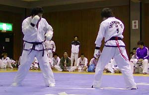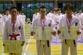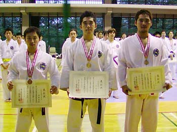 ![]() 優勝:寺戸謙太郎(東京城南支部) 練習量が不足していたので不安でした。 久々の試合だったので快勝とまではいきませんでしたが、地味な技でこつこ つと勝つことが出来ました。次回はT部のフルコンタクト・テコンドーの試合に エントリーし、頑張りたいと思います。 準優勝:森戸勝利(東京城南支部) 新ルールに慣れるのが難しかった。T部、U部、V部の三部制になってから初めて U部に出場しましたが、そのレベルの高さに驚きました。 3位:渡邉 実(横浜白楽支部) 練習量が少なかったので思うように動けませんでした。次回は 万全の体勢で試合に臨みたいです。 ![]() |