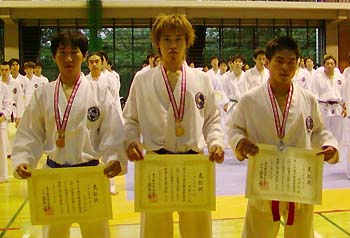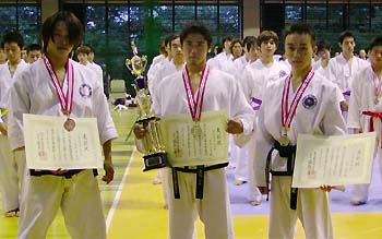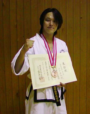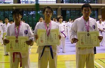 ![]() 優勝:本郷洋介(川崎支部) 最近の試合ではあまり納得いく結果が出せませんでしたので、 今回の優勝はとても嬉しく思います。 準優勝:生川 僚(豊田支部) ようやくここまで来れたかなと思います。 でもまだまだ満足できないので、優勝を目指して頑張ります。 3位:山田洋史(神奈川大学横浜校テコンドー部) 今回は初めて入賞できたので、うれしく思っています。 ですが、今日の試合で自分に足りないものがいろいろ見つかったので、 これからはそれを克服して精進していきたいと思っています。 |